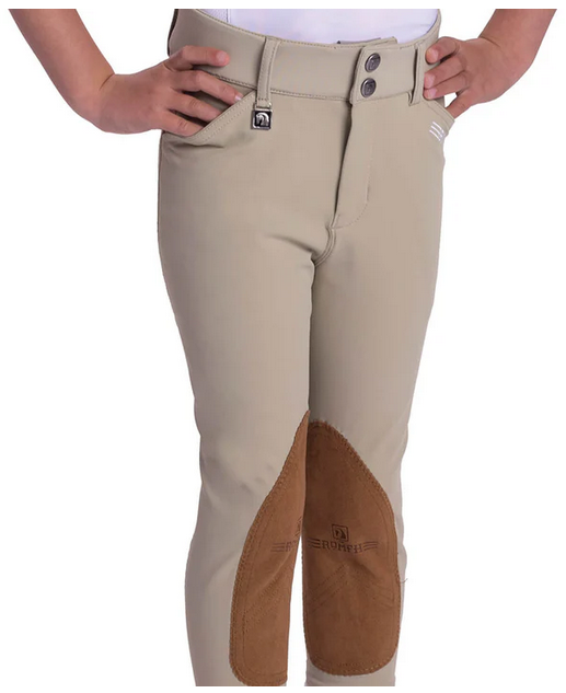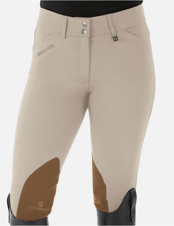 These jodhpurs are made with Romfh's popular Sarafina fabric - cool, soft, and stretchy. They have a wide two button waistband with front zip, slash pocket, Euro seat seams and sueded knee patches.