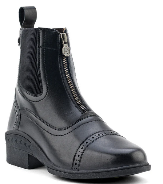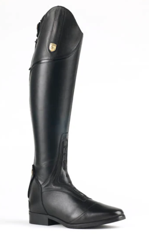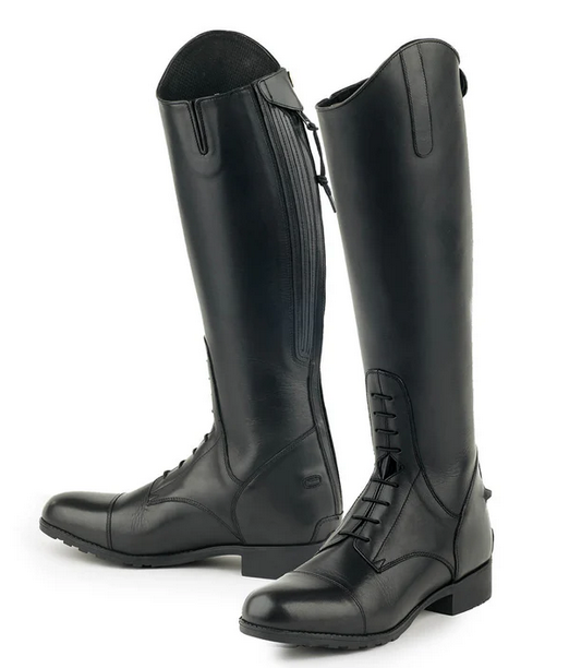 Crafted from very supple soft-touch premium cowhide with a cuff lining of genuine pigskin leather and moisture wicking lower shaft. The new Flex system pattern design affords the rider the ultimate in movement with full flexion of the ankle area immediately with first wearing. Added stretch panels on the inside of back zipper add supportive comfort and easy fitting at the calf. Twin side spur rests, classic toe cap styling, and elegant ripple sole add classic detailing at a remarkable price.