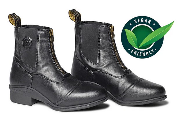 VEGAN FRIENDLY! The Mountain Horse Veganza Ladies Field Boots are a beautiful and well balanced all-round synthetic riding boot suitable for the competition arena. Features: -Strong and durable YKK zipper in the back -Elastic along the back of the shaft for a better individual fit -Ergonomically designed removable EVA insole -Slim outsole made for riding with dirt repellent tread zones -All materials are compatible with a Vegan lifestyle. Care: Clean debris from zippers and seams with a soft brush. Wipe off with a damp cloth. If this should not work, use a very mild soap and dry them after washing with a soft cloth.