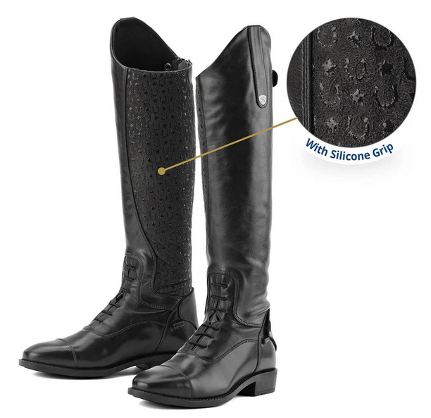 The Sofia boot collection is a synergy of classic style along with modern materials. The foot of the boot is made from full grain cow leather, with comfortable and soft moisture wicking mesh lining. The shafts are made from a technical synthetic leather that has all the visual features of genuine leather, but is breathable and durable, with a hint of stretch that enhances fit. Grip model features an inner leg made of breathable synthetic suede with a silicone horseshoe grip pattern to give the rider a more secure ride. Also features comfortable EVA insole, dual spur rests, zipper protector and traditional rubber sole system.