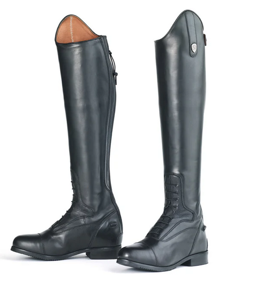 Traditional and timeless, the Mountain Horse(R) Sovereign Field Boot offers a more comfortable heels-down position with the unique Mountain Horse® Prolaze-Flexnotch™ Technology. Strong and durable full length YKK® Vislon zipper in back, snap zipper keeper at top of boot, durable hidden elastic along the side of the zipper for a comfortable fit, soft premium selected genuine leather lining, Spanish cut top, 9 sets of eyelets with fixed elastic lacing, exclusive Mountain Horse® Prolaze-Flexnotch™ Technology for a comfortable heels-down position, ergonomically-designed removable ShockX™ Advanced insole, protective heel cover with snap to safeguard your zipper, spur rest, exceptional High-Density™ outsole with grip responsive ripple zones for increased performance, integrated tempered steel shank for improved stability while riding and walking, and complimentary Mountain Horse® inflatable boot trees and boot bag included in box. Material: Full grain leather. Lining: Smooth full grain leather.